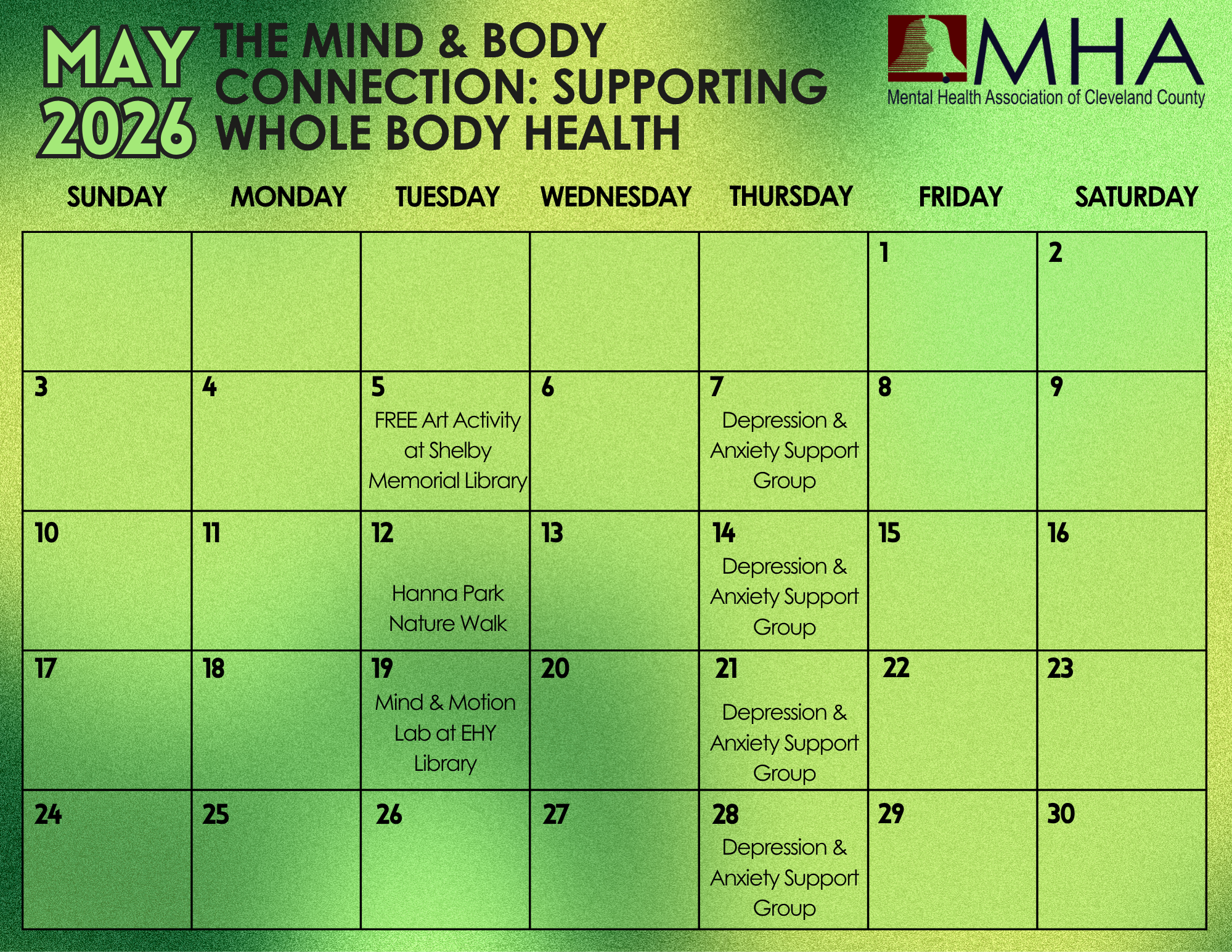 This list contains all events that are led by or in collaboration with the Mental Health Association of Cleveland County. You can also find these listed on our calendar.